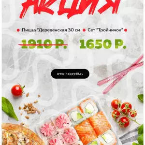 Вне зависимости от цен на снежного краба, угорь, лосось или икру летучей рыбы, в составе роллов от Хэппи всегда только оригинальные ингредиенты! Много лет мы готовим для вас лучшее из лучшего. А если еще не пробовали роллы от Хэппи, то у вас есть отличная возможность, ведь в городах Усмань и Грязи в...