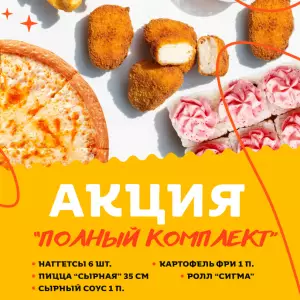 Пицца Сырная 35 см, Ролл Сигма, картофель фри (1 пор.), наггетсы 6 шт (1пор.), сырный соус (1 пор.)